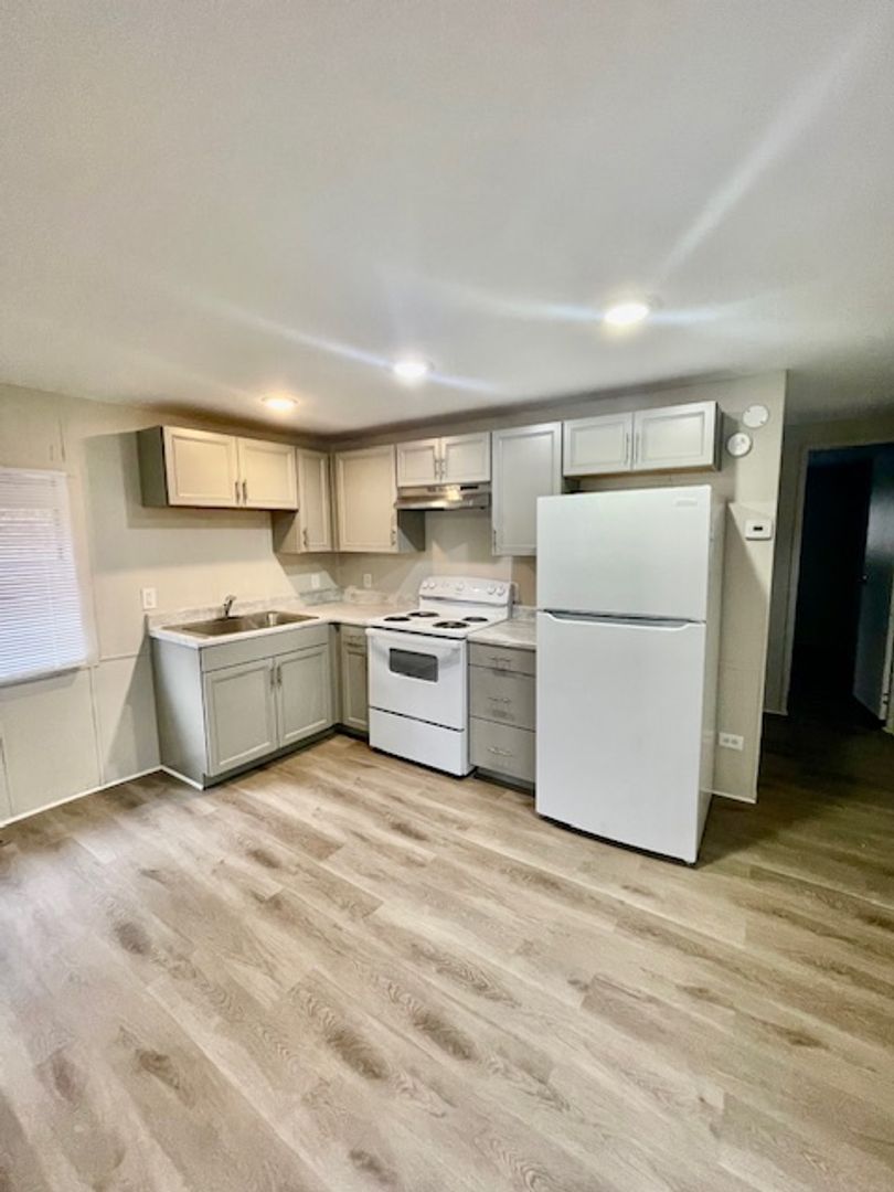 * Kitchen with fridge and stove